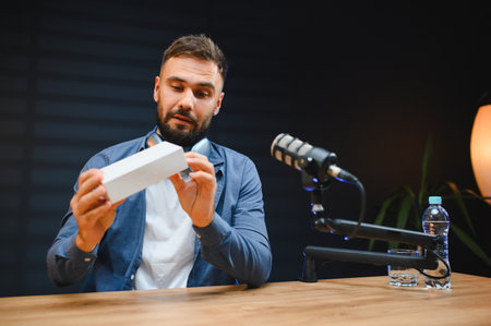 Content creator presenting product in a video blog, using professional microphone and headphones in a home studio setup