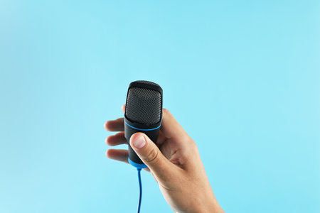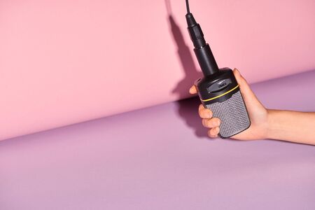Profesional Microphone on hands isolated black background. Podcast Concept