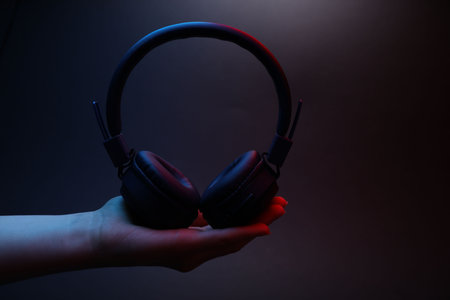 Classic black wireless headphones on colored paper background. Retro style. 80s. Pop culture. Top view. Minimal Music Concept. Hands holding