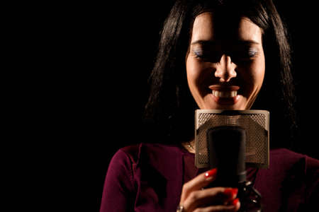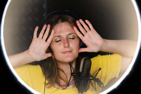 The woman sings at the recording Studio with her hands near her head. Happy young woman singing a song behind the microphone.