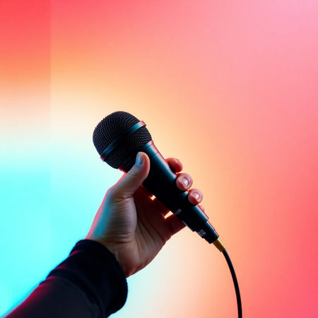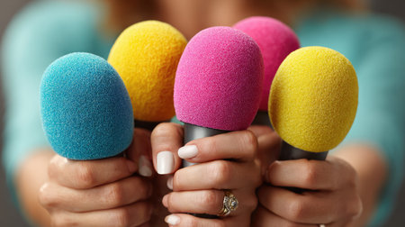 This vibrant image features colorful microphone props held in hands, perfect for creative events, performances, and engaging presentations, evoking a playful atmosphere.