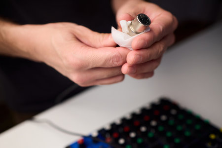 Personnel meticulously maintain audio equipment hygiene, Detailed shot of technician carefully cleaning audio cable with soft cloth in professional studio environment