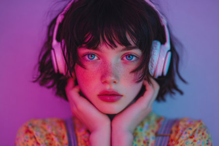 Modern young woman sitting in studio in pink and yellow neon light recording sounds for ASMR vlog using pharmaceutical blister pack