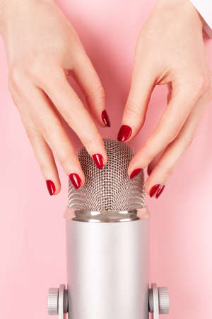 Woman hand with perfect manicure near the microphone. Making ASMR sounds.