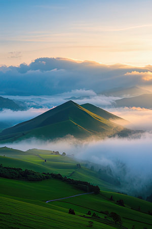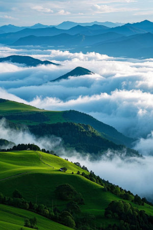 Green hillsides covered by a sea of clouds
