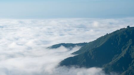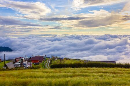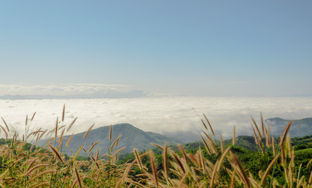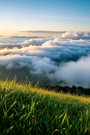 Sea of clouds and blue sky on the grassy slope