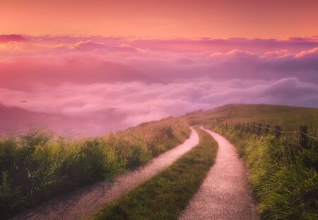 landscape background of morning path on foggy mountains
