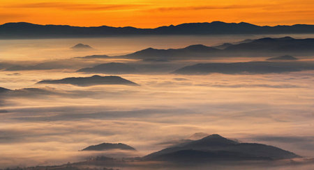 misty landscape at sunset, mountains rising from clouds of fog in the background, clear sky - mountain Klet, Czech republic