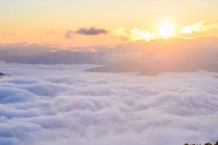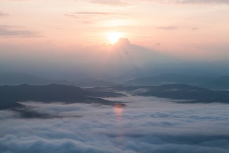 Sea Fog and Golden sunrise covers the area on the top of hill Doi Phu Thok, Chiang Khan, Loei, Thailand with background of sunrise on winter.