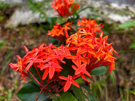 Beautiful view of Ixora coccinea flowering plant. Also known as jungle geranium, flame of the woods or jungle flame. National flower of Suriname. Selective focus