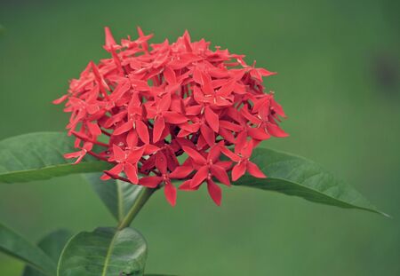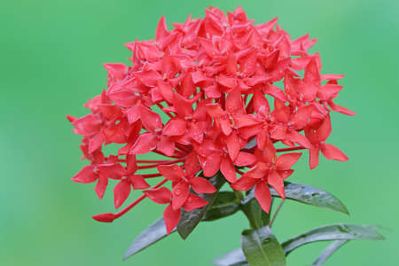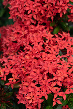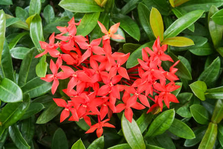 Spike flower, Rubiaceae flower, Ixora coccinea. Close up group of red flower spike and green leaves for hedge plant in the garden