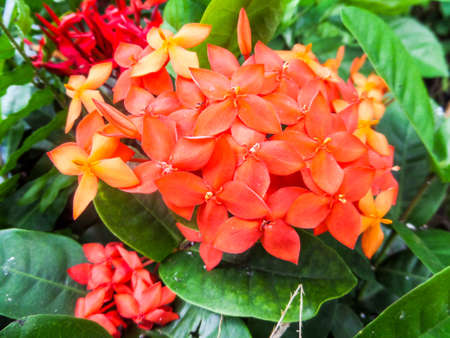 The flower clusters of Ixora finlaysoniana in red color of blooming stage.