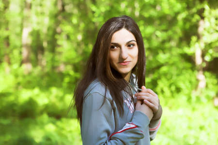 Portrait of a latin woman with curly hair looking straight distracted outdoors