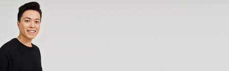 A fashionable young man in a black shirt poses with a genuine smile on his face, exuding confidence and style.