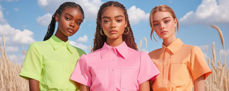 A group of young individuals pose together, wearing colorful and trendy urban clothing. The image showcases a diverse mix of ethnic backgrounds, emphasizing inclusivity and modern youth fashion.. AI Generation