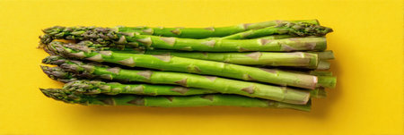 Vibrant green asparagus spears lie in a neat row on a bright yellow surface, showcasing fresh produce for cooking.