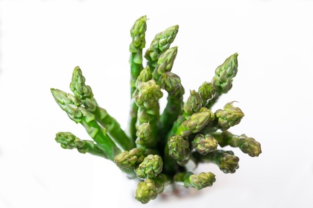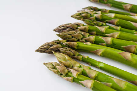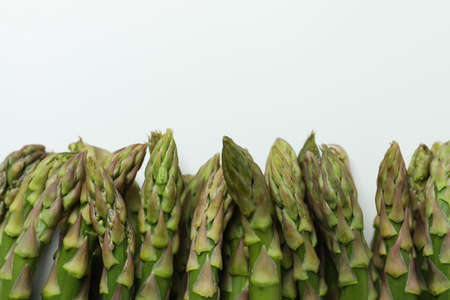 Close up of fresh green asparagus spears on white background.