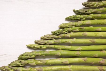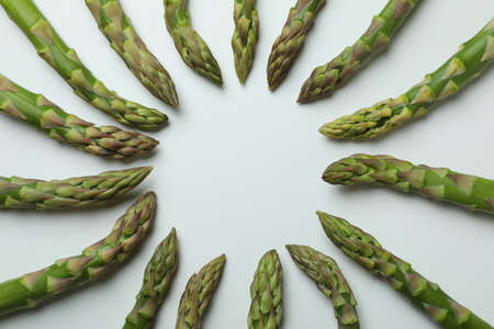raw green asparagus on a white acrylic background.