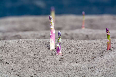 New harvest season on asparagus vegetable fields, white and purple asparagus growing uncovered on farm, agriculture in Netherlands