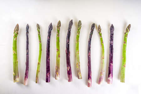 Fresh raw organic asparagus bunch, purple, green and white vegetable on white background