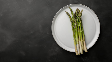 Fresh green asparagus on a white plate on a black background