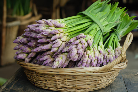 A rustic woven basket holds vibrant purple flowers freshly gathered showcasing natures beauty in a simple setting.