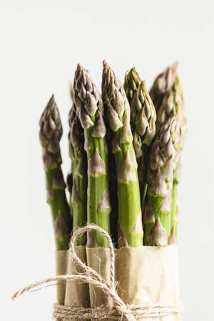 Close up view of bunch of fresh asparagus tied rope.