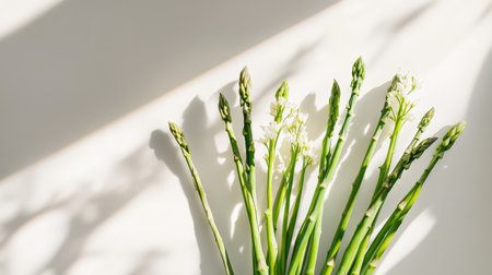 Fresh green asparagus spears are arranged next to delicate white flowers, casting soft shadows on a light surface, highlighting their natural beauty.
