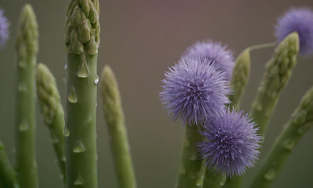 purple asparagus flowers with water droplets on petals