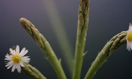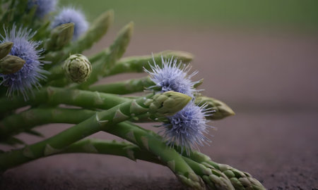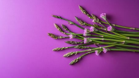 A vibrant arrangement of fresh green asparagus and delicate pink flowers on a purple background, perfect for showcasing healthy and organic food themes.