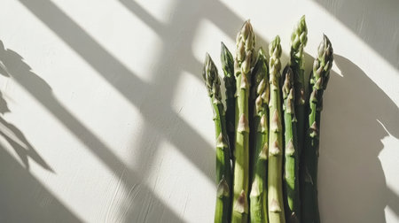 A close-up view of fresh green asparagus stalks on a white surface, beautifully enhanced by unique shadow patterns reflecting light.