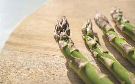 Detail of fresh green aspargus heads on a wooden kitchen boad with bright light