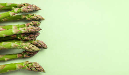 Fresh asparagus on light green background. Top view. Copy space.