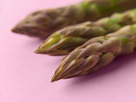 Macrophotography of upper part of fresh raw green asparagus stalks on a pastel pink background. Ingredient for healhy eating, vegetarian and raw food diet. Close-up.