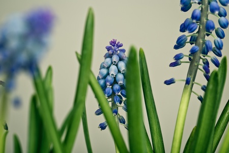 Moody blue muscary flowers close up spring background