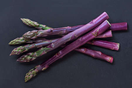 Asparagus. Fresh purple asparagus on black slate background. top view
