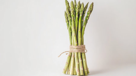 A fresh bundle of green asparagus tied with twine against a white background, perfect for highlighting healthy eating and culinary creativity.
