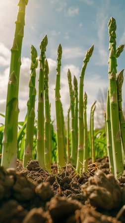A close up of several green and brown asparagus plants. The asparagus are in various stages of growth, with some being more mature than others. Scene is one of growth and development