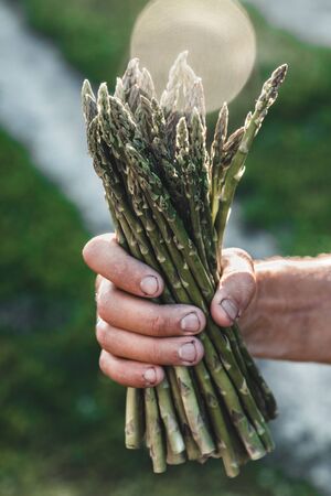 Asparagus sprouts in hands of a farmer