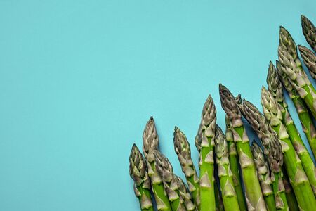 An edible, raw stems of asparagus on blue background.