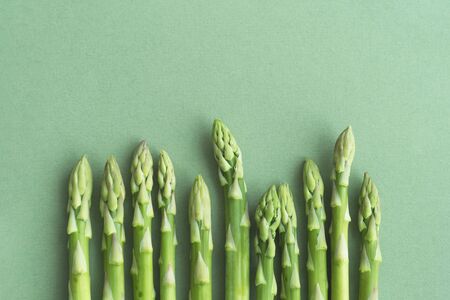 Young asparagus sticks on green background from above. Diet food concept.