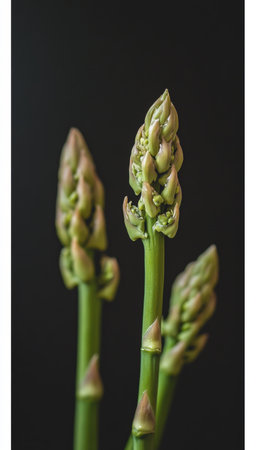 Three isolated Vibrant Green Asparagus Sprouts, Slender Stalks, Fresh Produce, on Black Background