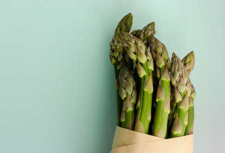 Fresh green asparagus branches in an eco paper cardboard bag on a light green or blue clear background with free space for text. Healthy organic vegetarian uncooked natural food. Fitness diet concept.
