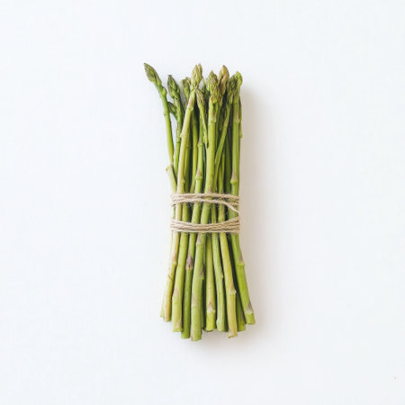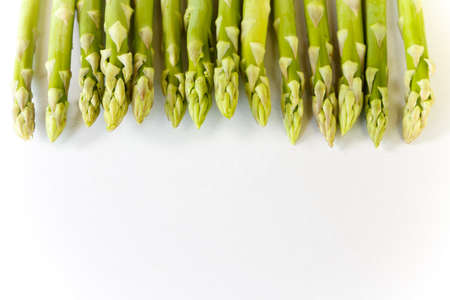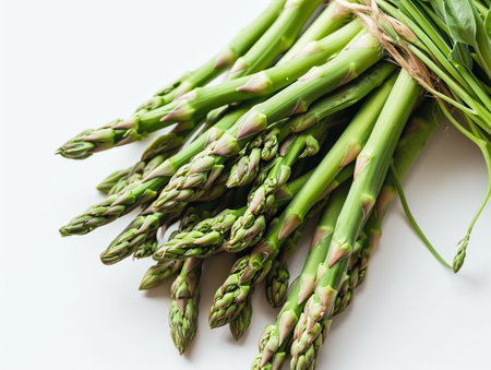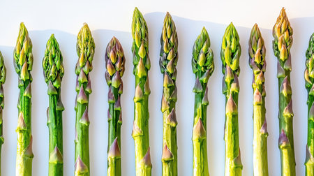 A vibrant display of fresh green asparagus stalks arranged in a neat row on a clean white background, perfect for illustrating healthy eating or fresh ingredients.