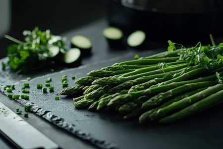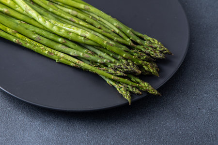 Fresh green asparagus spears arranged on a black plate against a dark gray background, highlighting the vibrant vegetables and textures.