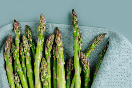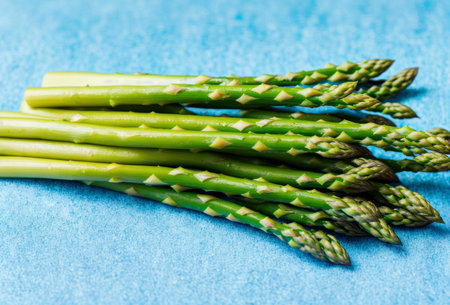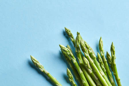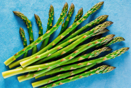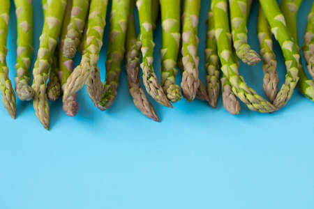 Organic asparagus tips scattered on a sky blue background. AI generated.