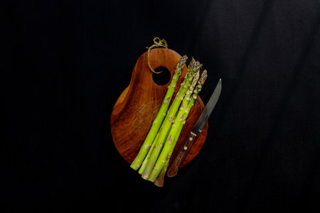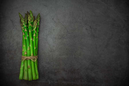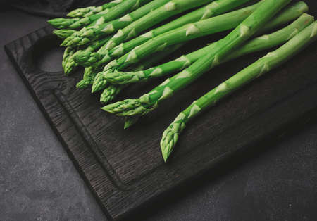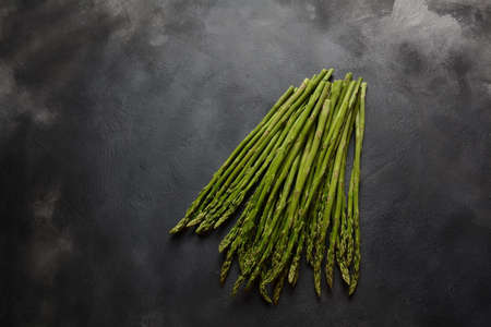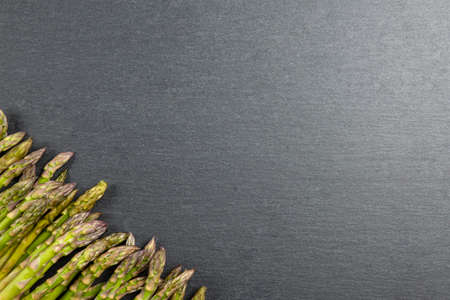Asparagus stems against black slate background. Concept of healthy nutrition, food and seasonal vegetables harvest. Close up, copy space