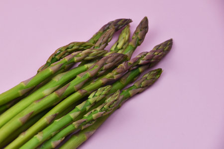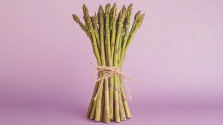A vibrant bunch of fresh green asparagus tied with natural twine, set against a soft pink background, perfect for culinary and health themes.