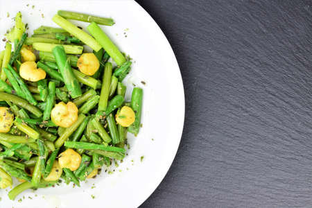 Plate of asparagus with prawns, a touch of spices and olive oil, slate stone background. Copy space.