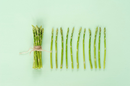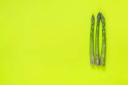 Beautiful food art background. Asparagus sprouts on bright green surface.